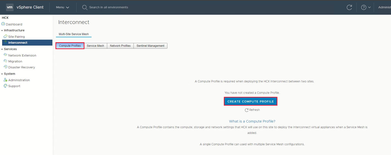 Wählen Sie unter Infrastructure (Infrastruktur) Folgendes aus: Interconnect>Compute Profiles>Create Compute Profile („Verbinden“ > „Compute-Profile“ > „Compute-Profil erstellen“).