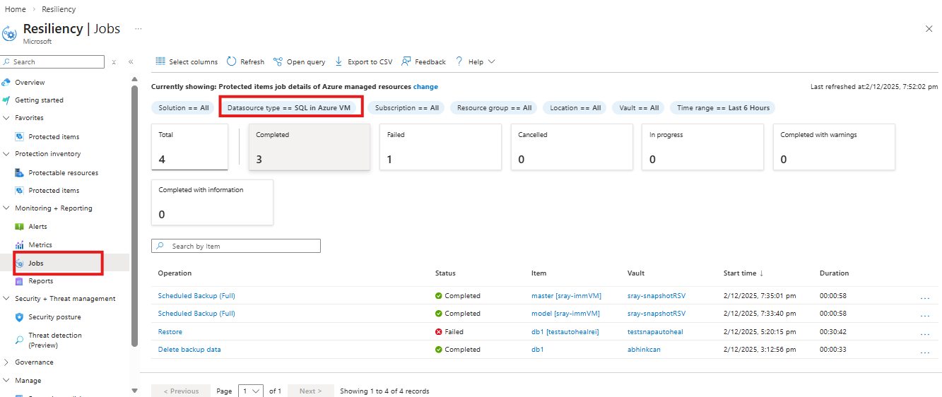 Wechseln Sie im Azure-Portal zu Resiliency>Monitoring + Reporting>Jobs.