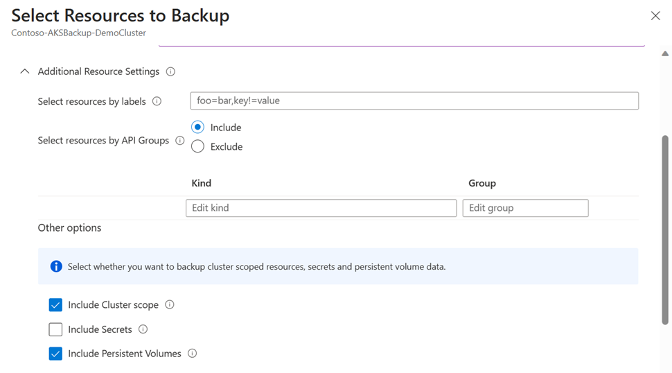 env=prod;tier!=webeingeben, wählt der Prozess Ressourcen aus, die über ein Label mit dem Schlüsselenvund dem Wertprodsowie über eine Bezeichnung mit dem Schlüsseltier, für die der Wert nichtwebist, verfügen. Für diese Ressourcen wird ein Backup erstellt.API-Gruppen: Sie können Ressourcen auch auswählen, indem Sie die AKS-API-Gruppe und den Typ angeben. Sie können beispielsweise für Backup-AKS-Ressourcen wie Bereitstellungen auswählen.