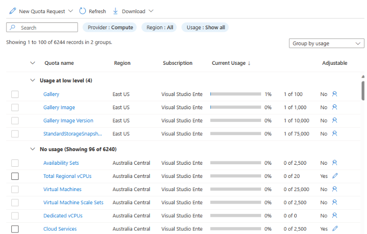 Unter Beschränkungen des Azure-Abonnements und -Diensts werden einige der am häufigsten geltenden Kontingente für Azure-Ressourcen aufgeführt. Zu den am häufigsten in einem Lab verwendeten Ressourcen, für die eventuell Kontingente gelten, zählen VM-Kerne, öffentliche IP-Adressen, Netzwerkschnittstellen, verwaltete Datenträger, Azure-Rollenzuweisung und ExpressRoute-Verbindungen.