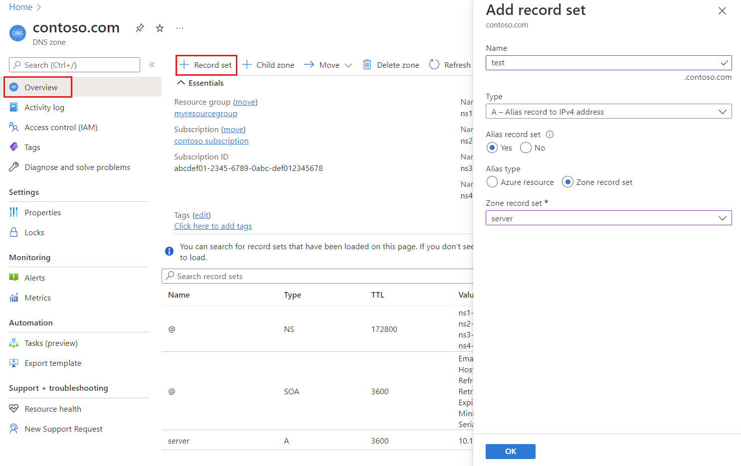 - Wählen Sie die DNS-Zone contoso.com aus.