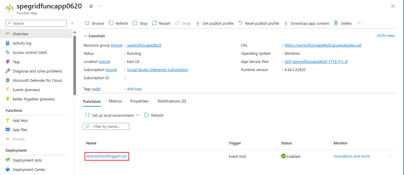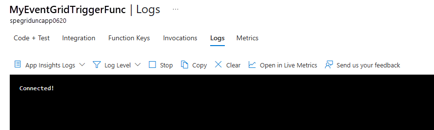 Invoke-WebRequest-Cmdlet, um das Ereignis zu senden:Invoke-WebRequest -Uri $endpoint -Method POST -Body $body -Headers @{"aeg-sas-key" = $keys.Key1}Vergewissern Sie sich, dass die Nachricht aus der Funktion auf der Registerkarte Protokolle Für Ihre Funktion im Azure-Portal angezeigt wird.
