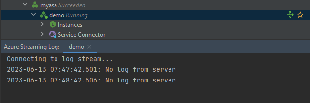 Öffnen Sie das Azure Explorer-Fenster, erweitern Sie den Knoten Azure, erweitern Sie den Dienstknoten Azure Spring Apps, erweitern Sie die von Ihnen erstellte Azure Spring Apps-Instanz, und wählen Sie dann die demo-Instanz der von Ihnen erstellten App aus.