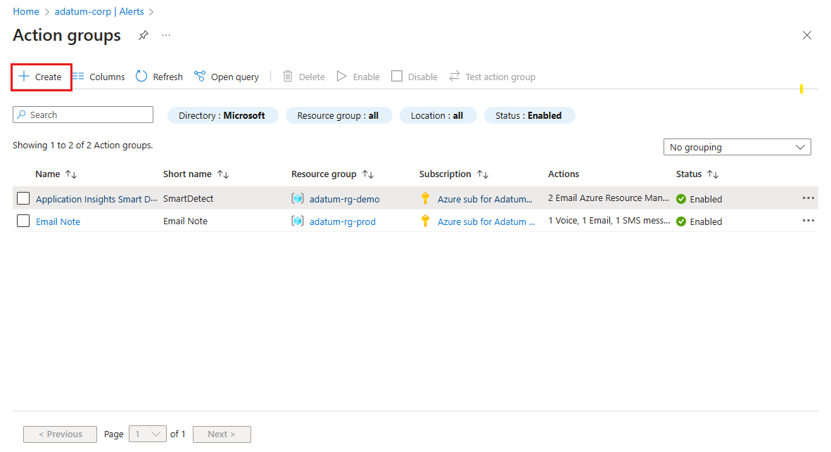Wählen Sie auf der Seite Aktionsgruppen die Option Erstellen aus.