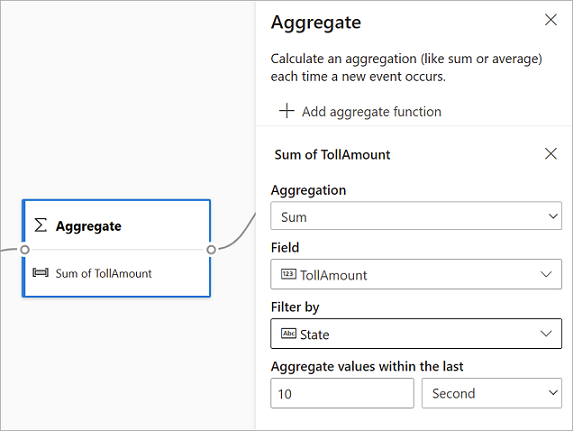 Wählen Sie das Transformationssymbol aus, um eine Aggregation hinzuzufügen. Verbinden Sie dann eine Eingabe, wählen Sie die Aggregation aus, fügen Sie eventuelle Filter- oder Slicedimensionen hinzu, und wählen Sie den Zeitraum aus, über den die Aggregation berechnet werden soll. In diesem Beispiel berechnen wir die Summe des Mautwerts über die letzten 10 Sekunden nach dem Bundesstaat, in dem sich Fahrzeug befindet.