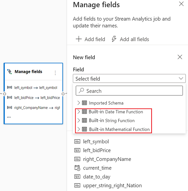 Sie können auch mit den integrierten Funktionen neue Felder hinzufügen, um die Daten aus dem Upstream zu aggregieren. Die von uns unterstützten integrierten Funktionen sind derzeit einige Funktionen in Zeichenfolgenfunktionen, Datums- und Uhrzeitfunktionen, Mathematische Funktionen. Weitere Informationen zu den Definitionen dieser Funktionen finden Sie unter Integrierte Funktionen (Azure Stream Analytics).
