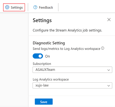 Runtimeprotokolle werden auf der Warn-, Fehler- oder Informationsebene angezeigt, wenn ein Auftrag ausgeführt wird. Diese Protokolle sind hilfreich, wenn Sie die Topologie oder Konfiguration Ihres Stream Analytics-Auftrags für die Problembehandlung bearbeiten möchten. Wir empfehlen Ihnen dringend, die Diagnoseprotokolle zu aktivieren und an den Log Analytics-Arbeitsbereich in Einstellungen zu senden, um mehr Erkenntnisse über Ihre ausgeführten Aufträge zum Debuggen zu erhalten.