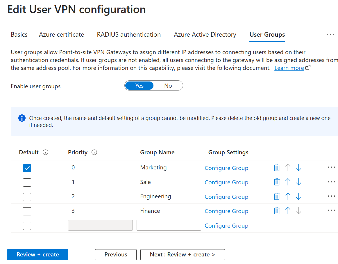 Klicken Sie auf Ja, um Benutzergruppen zu aktivieren. Wird diese Serverkonfiguration einem P2S-VPN-Gateway zugewiesen, werden Benutzer*innen derselben Benutzergruppen IP-Adressen aus den gleichen Adresspools zugewiesen. Benutzer*innen, die Mitglied verschiedener Gruppen sind, werden IP-Adressen aus verschiedenen Gruppen zugewiesen. Wenn Sie dieses Feature verwenden möchten, müssen Sie für eine der von Ihnen erstellten Gruppen die Option Standard aktivieren.