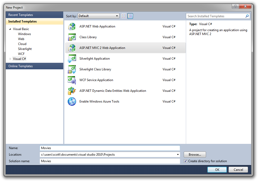 Sie können Anwendungen mit Visual Basic oder Visual C# erstellen. Wählen Sie zunächst auf der linken Seite Visual C# aus, und wählen Sie dann "ASP.NET MVC 2-Webanwendung" aus. Nennen Sie Ihr Projekt "Filme", und klicken Sie auf OK.