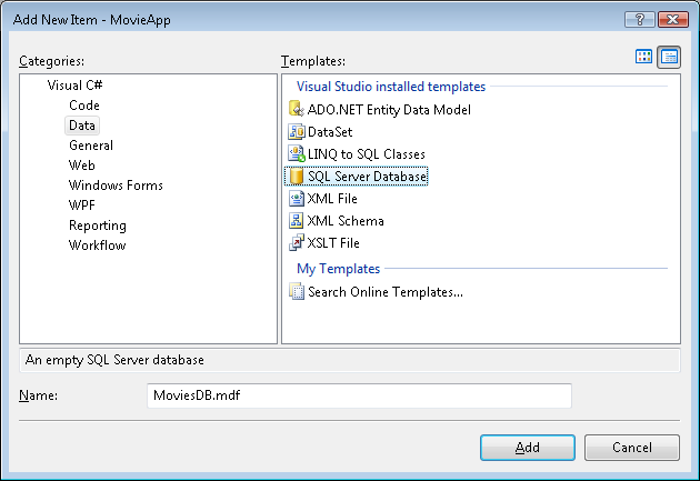 - Benennen Sie die neue Datenbank MoviesDB.mdf, und klicken Sie auf die Schaltfläche "Hinzufügen ".