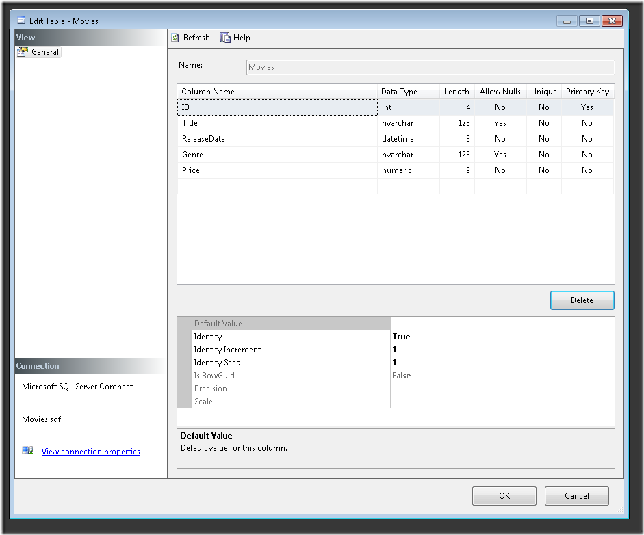 Wenn beim Doppelklicken auf "Movies.sdf" eine Fehlermeldung angezeigt wird, stellen Sie sicher, dass Sie SQL Server Compact 4.0 (Runtime + Tools-Unterstützung) installiert haben. (Links zur Software finden Sie in der Liste der Voraussetzungen in Teil 1 dieser Lernprogrammreihe.) Wenn Sie die Version jetzt installieren, müssen Sie Visual Web Developer schließen und erneut öffnen.