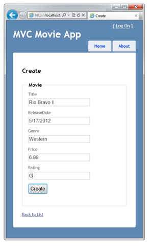 Öffnen Sie als Nächstes die Datei \Views\Movies\Create.cshtml , und fügen Sie das folgende Markup am Ende des Formulars hinzu. Dadurch wird ein Textfeld gerendert, sodass Sie beim Erstellen eines neuen Films eine Bewertung angeben können.