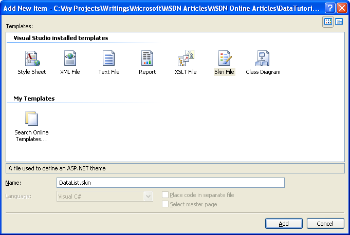 Wenn Sie eine Skin-Datei hinzufügen möchten, klicken Sie mit der rechten Maustaste auf den App_Themes/DataWebControls Ordner, wählen Sie "Neues Element hinzufügen" und dann in der Liste die Option "Skin File" aus. Nennen Sie die Datei DataList.skin.