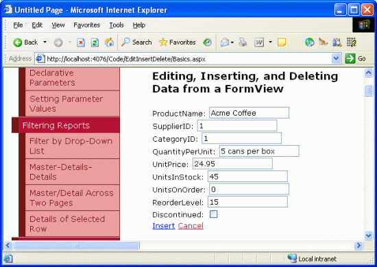 <asp:FormView ID="FormView1" runat="server" DataKeyNames="ProductID" DataSourceID="ObjectDataSource1" AllowPaging="True"> <EditItemTemplate> ... </EditItemTemplate> <InsertItemTemplate> ProductName: <asp:TextBox ID="ProductNameTextBox" runat="server" Text="<%# Bind("ProductName") %>"> </asp:TextBox><br /> SupplierID: <asp:TextBox ID="SupplierIDTextBox" runat="server" Text="<%# Bind("SupplierID") %>"> </asp:TextBox><br /> CategoryID: <asp:TextBox ID="CategoryIDTextBox" runat="server" Text="<%# Bind("CategoryID") %>"> </asp:TextBox><br /> QuantityPerUnit: <asp:TextBox ID="QuantityPerUnitTextBox" runat="server" Text="<%# Bind("QuantityPerUnit") %>"> </asp:TextBox><br /> UnitPrice: <asp:TextBox ID="UnitPriceTextBox" runat="server" Text="<%# Bind("UnitPrice") %>"> </asp:TextBox><br /> UnitsInStock: <asp:TextBox ID="UnitsInStockTextBox" runat="server" Text="<%# Bind("UnitsInStock") %>"> </asp:TextBox><br /> UnitsOnOrder: <asp:TextBox ID="UnitsOnOrderTextBox" runat="server" Text="<%# Bind("UnitsOnOrder") %>"> </asp:TextBox><br /> ReorderLevel: <asp:TextBox ID="ReorderLevelTextBox" runat="server" Text="<%# Bind("ReorderLevel") %>"> </asp:TextBox><br /> Discontinued: <asp:CheckBox ID="DiscontinuedCheckBox" runat="server" Checked="<%# Bind("Discontinued") %>" /><br /> CategoryName: <asp:TextBox ID="CategoryNameTextBox" runat="server" Text="<%# Bind("CategoryName") %>"> </asp:TextBox><br /> SupplierName: <asp:TextBox ID="SupplierNameTextBox" runat="server" Text="<%# Bind("SupplierName") %>"> </asp:TextBox><br /> <asp:LinkButton ID="InsertButton" runat="server" CausesValidation="True" CommandName="Insert" Text="Insert"> </asp:LinkButton> <asp:LinkButton ID="InsertCancelButton" runat="server" CausesValidation="False" CommandName="Cancel" Text="Cancel"> </asp:LinkButton> </InsertItemTemplate> <ItemTemplate> ... </ItemTemplate> </asp:FormView>