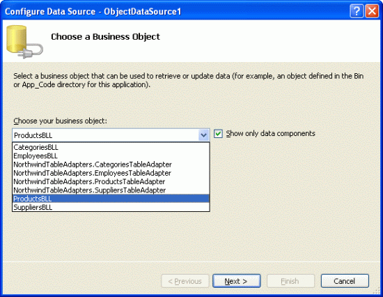 Abbildung 5: Konfigurieren der ObjectDataSource für die Verwendung der ProductsBLL Klasse (Klicken Sie hier, um das Bild in voller Größe anzuzeigen)