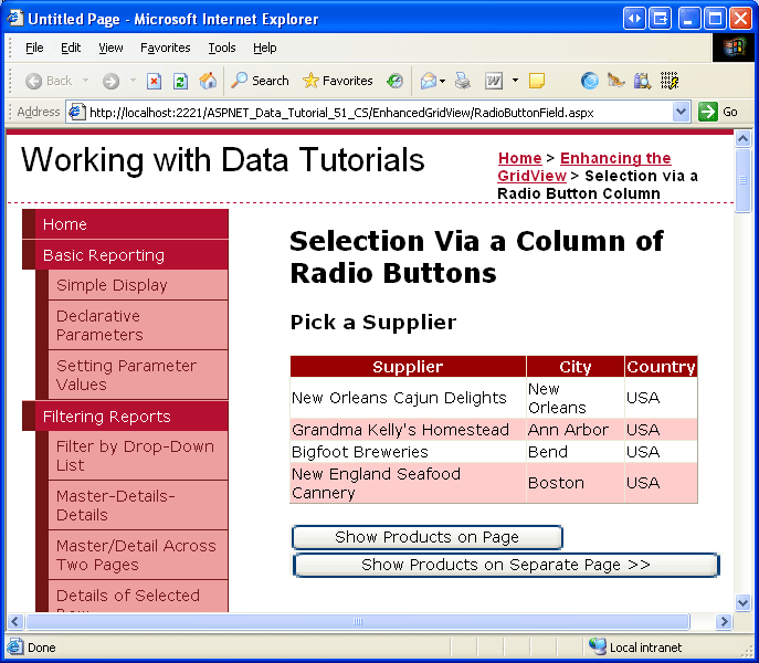 Dieser Code funktioniert einwandfrei, solange eines der Optionsfelder aus der GridView ausgewählt ist. Wenn die GridView anfänglich keine Optionsfelder ausgewählt hat und der Benutzer auf die SendToProducts Schaltfläche klickt, wird SuppliersSelectedIndex-1, was dazu führt, dass eine Ausnahme ausgelöst wird, da -1 außerhalb des Indexbereichs der DataKeys Auflistung liegt. Dies ist jedoch kein Problem, wenn Sie sich entschieden haben, den RowCreated Ereignishandler zu aktualisieren, wie in Schritt 3 beschrieben, damit das erste Optionsfeld in der GridView standardmäßig ausgewählt ist.