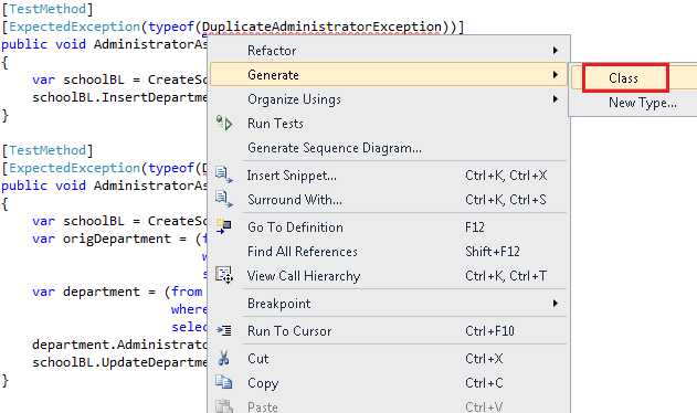 Löschen Sie nun die temporäre Datei DuplicateAdministratorException.cs , die Sie zuvor im Testprojekt erstellt haben, um kompilieren zu können.