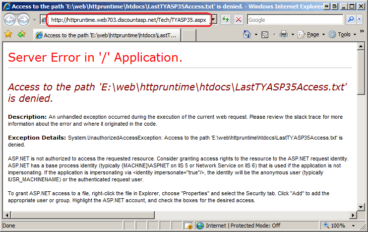 Stellen Sie die Webanwendung in der Produktion bereit, und besuchen Sie dann die gehostete Seite Teach Yourself ASP.NET 3.5 in der 24-Stunden-Buchüberprüfungsseite . An diesem Punkt sollte entweder die Buchüberprüfungsseite normal oder die in Abbildung 2 dargestellte Fehlermeldung angezeigt werden. Einige Webhostanbieter erteilen schreibberechtigungen für das anonyme ASP.NET Computerkonto. In diesem Fall funktioniert die Seite ohne Fehler. Wenn Ihr Webhostanbieter jedoch den Schreibzugriff für das anonyme Konto verbietet, wird eine UnauthorizedAccessException Ausnahme ausgelöst, wenn die TYASP35.aspx Seite versucht, das aktuelle Datum und die aktuelle Uhrzeit in die LastTYASP35Access.txt Datei zu schreiben.