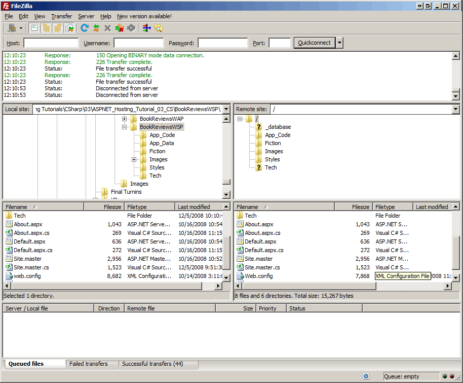 Abbildung 1 zeigt FileZilla, nachdem die erforderlichen Dateien kopiert wurden. FileZilla zeigt die Dateien auf dem lokalen Computer auf der linken Seite und die Dateien auf dem Remotecomputer auf der rechten Seite an. Wie Abbildung 1 zeigt, befinden sich die ASP.NET Quellcodedateien, z About.aspx.cs. B. , auf dem lokalen Computer (der Entwicklungsumgebung), wurden aber nicht in den Webhostanbieter (die Produktionsumgebung) kopiert, da Codedateien nicht bereitgestellt werden müssen, wenn die explizite Kompilierung verwendet wird.