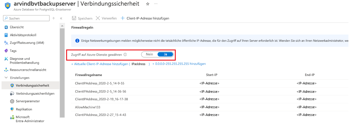 - Stellen Sie in Azure Database for PostgreSQL Server den Wert für Zugriff auf Azure-Dienste zulassen auf Ja.