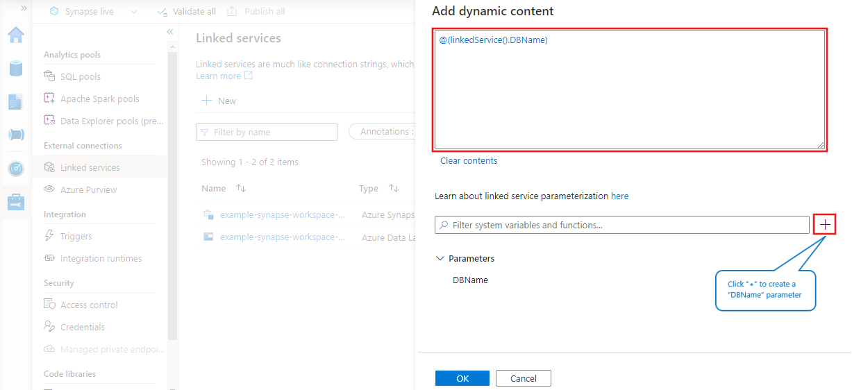 Sie können verknüpfte Dienste mithilfe der Benutzeroberfläche im Azure-Portal oder über eine Programmierschnittstelle parametrisieren.