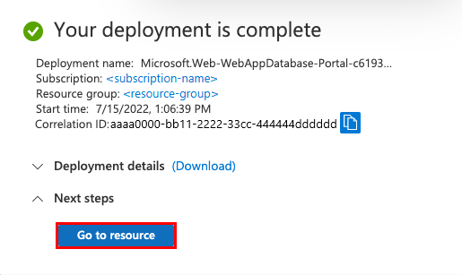 - Die Ressourcengruppe für die App. Mit einer Ressourcengruppe können Sie (in einem logischen Container) alle für die Anwendung benötigten Azure-Ressourcen gruppieren.