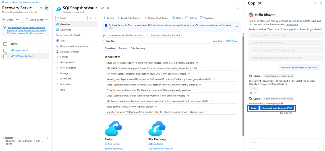Navigieren Sie im Azure-Portal zum Sicherungstresor, und wählen Sie dann Copilot aus.
