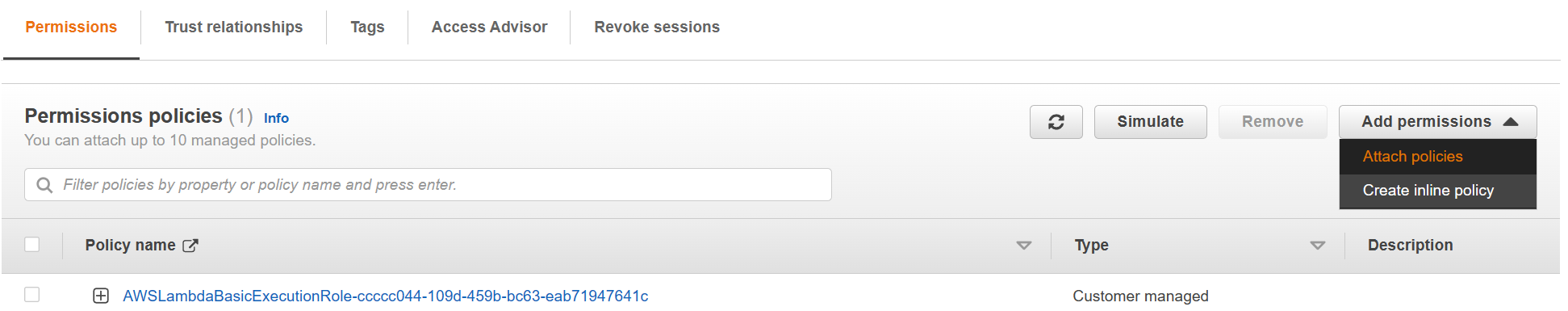 Wählen Sie unter Permissions policies die Optionen Add permissions>Attach policies aus.