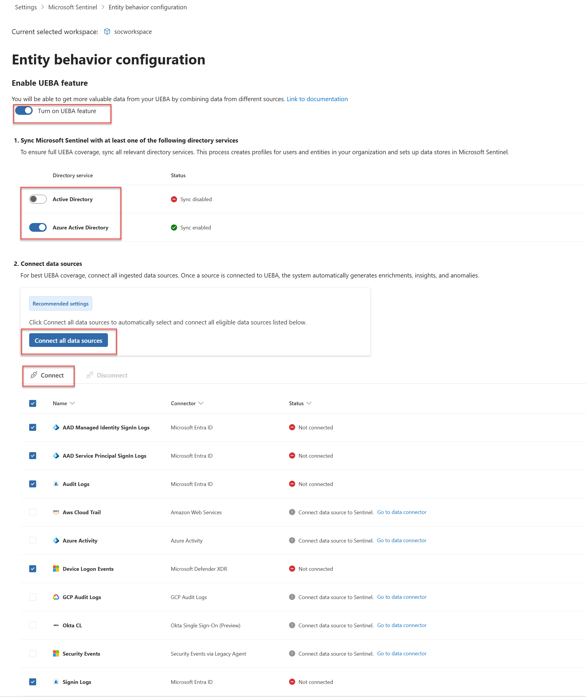 - Aktivieren Sie in den Microsoft Sentinel-Arbeitsbereichseinstellungen UEBA für Ihren Arbeitsbereich, und wählen Sie aus, welche Datenquellen im Microsoft Defender-Portal oder azure-Portal verbunden werden sollen.