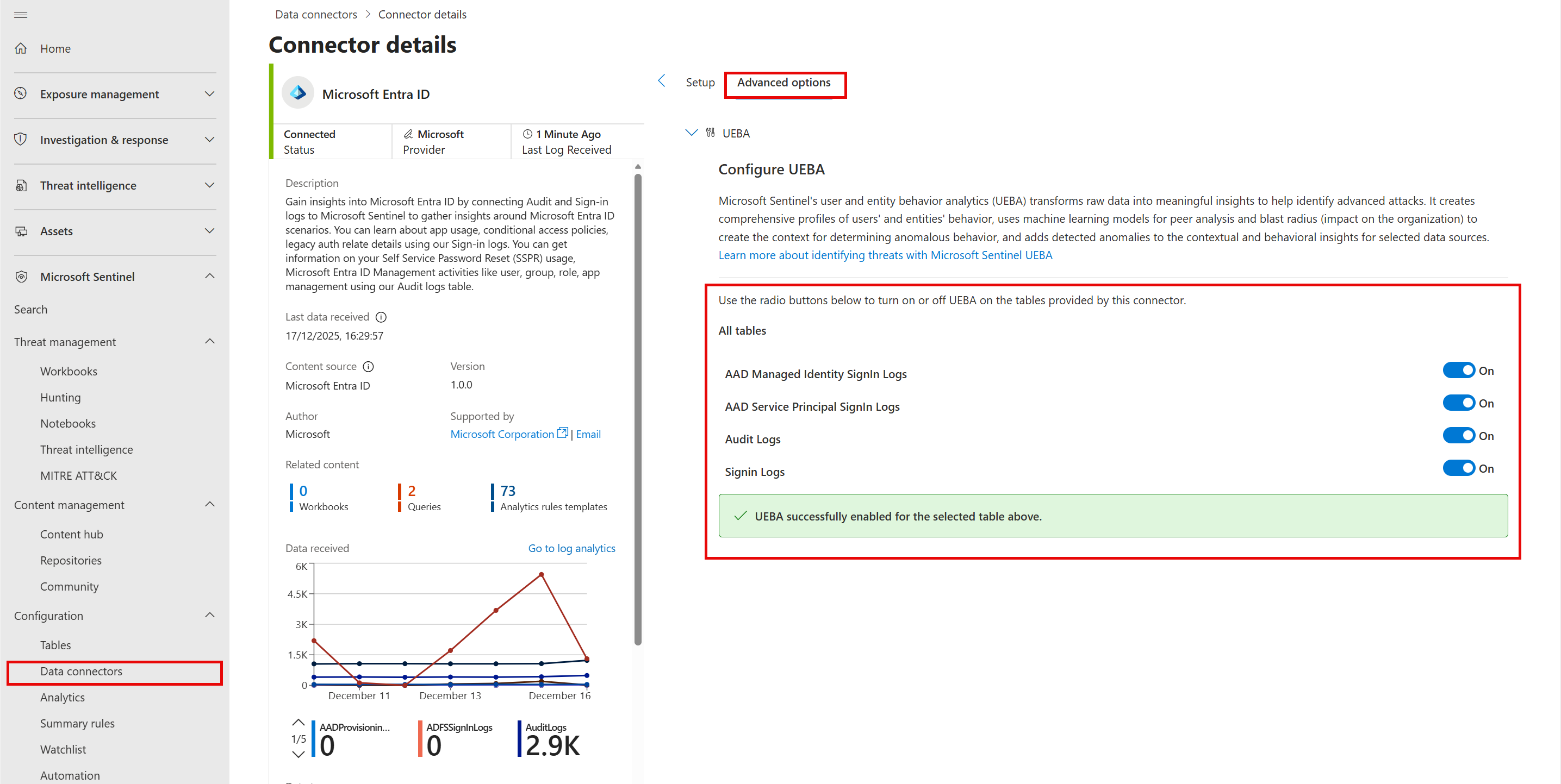 So aktivieren Sie UEBA von unterstützten Datenkonnektoren im Microsoft Defender-Portal: