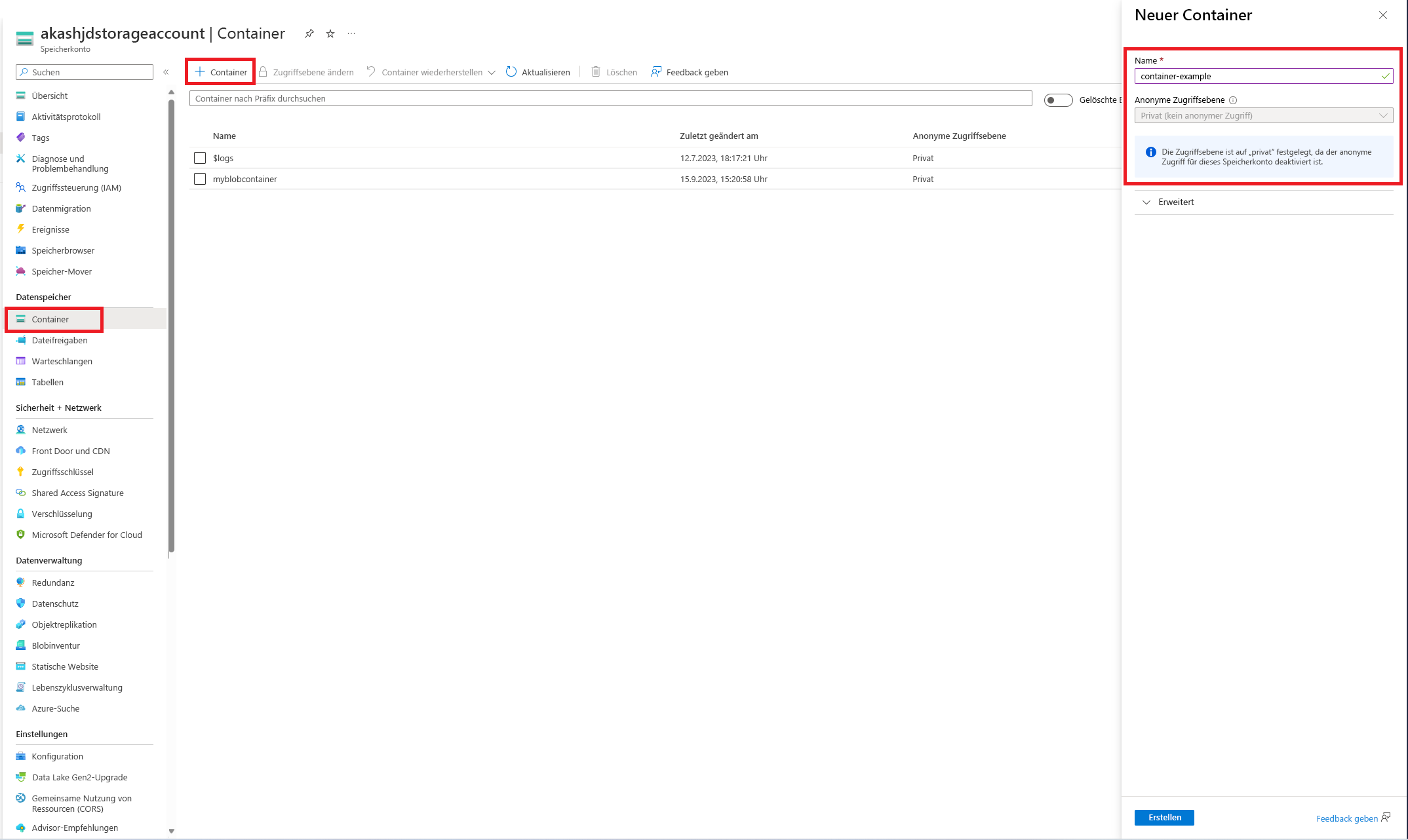 Geben Sie im Bereich "Neuer Container " einen Namen für den neuen Container an. Der Containername muss klein geschrieben werden, mit einem Buchstaben oder einer Zahl beginnen und darf nur Buchstaben, Zahlen und Bindestriche (-) enthalten. Der Name muss außerdem zwischen 3 und 63 Zeichen lang sein. Weitere Informationen zu Container- und Blobnamen finden Sie unter Benennen und Verweisen auf Container, Blobs und Metadaten.