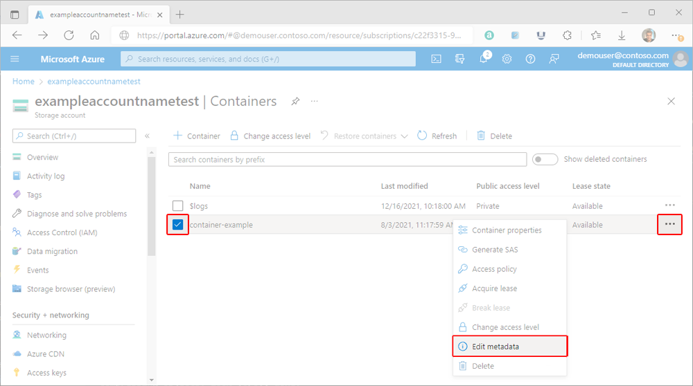 Wählen Sie die Schaltfläche " Weitere " (...) des Containers aus, und wählen Sie dann "Metadaten bearbeiten " aus, um den Containermetadatenbereich anzuzeigen.