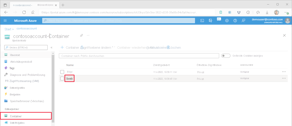 2. Wählen Sie im Bereich "Container " den $web Container aus, um den Übersichtsbereich des Containers zu öffnen.