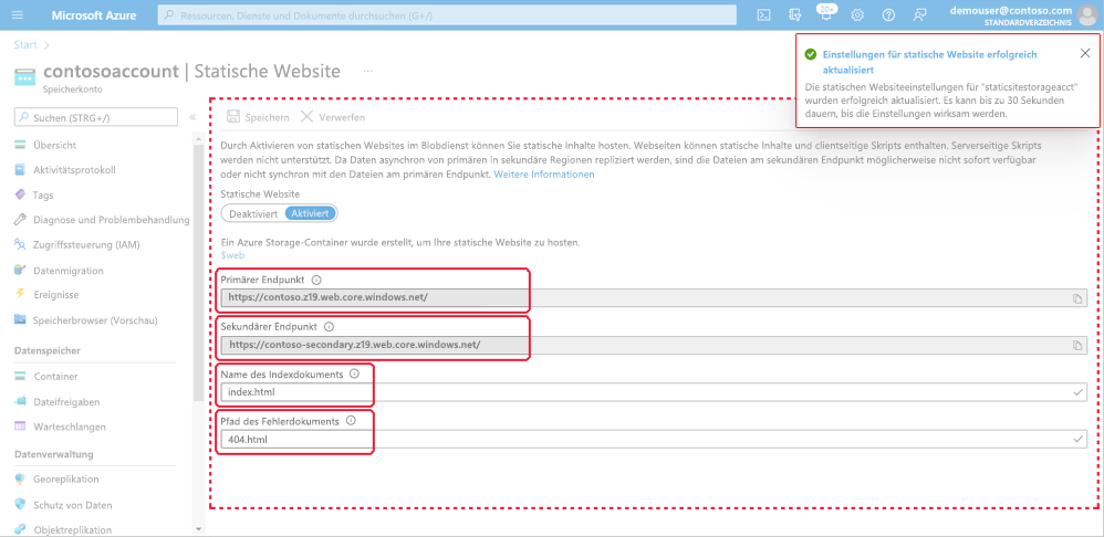 Statisches Websitehosting ist ein Feature, das Sie für das Speicherkonto aktivieren müssen.