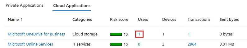 Identifizieren Sie die Cloudanwendungen, auf die Benutzer zugreifen (mithilfe des Microsoft Defender für Cloud Apps Cloud-App-Katalogs), für Internet- und Microsoft 365-Datenverkehr. Details umfassen Name, Kategorien, Risikobewertung, Anzahl der Benutzer, Gesendete Bytes, Empfangene Bytes, Datum des letzten Zugriffs und Datum des ersten Zugriffs .