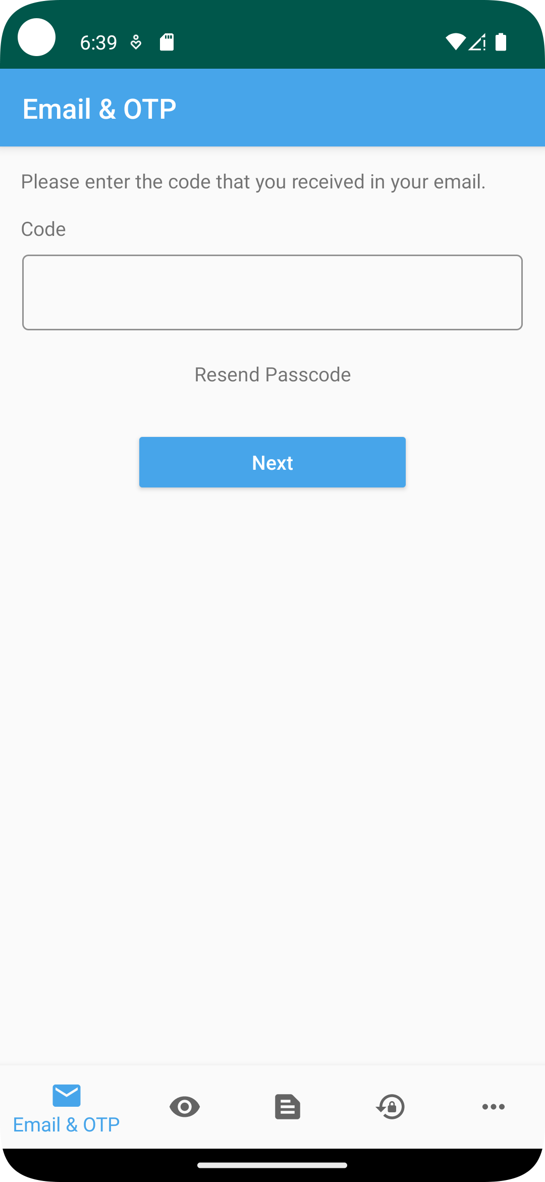 Geben Sie den OTP-Code ein, den Sie im E-Mail-Posteingang erhalten, und wählen Sie "Weiter" aus. Wenn die Registrierung erfolgreich ist, meldet sich die App automatisch an. Wenn Sie den OTP-Code in Ihrem E-Mail-Posteingang nicht erhalten, können Sie ihn nach einiger Zeit erneut senden lassen, indem Sie Passcode erneut senden auswählen.