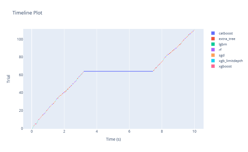 Ein Zeitleisten-Plot, der häufig als Gantt-Diagramm oder eine Abfolge von Balken dargestellt wird, visualisiert den Anfang, die Dauer und den Abschluss von Aufgaben im Laufe der Zeit. Im Kontext eines AutoML- oder Tuning-Experiments kann ein Zeitleisten-Plot die Entwicklung verschiedener Modellauswertungen und deren jeweilige Dauer darstellen, die gegen die Zeit gezeichnet werden. Durch die Beobachtung dieses Plot können Benutzer die Effizienz des Suchprozesses erfassen, potenzielle Engpässe oder Leerlaufzeiten identifizieren und die zeitliche Dynamik verschiedener Hyperparameterbewertungen erkennen.