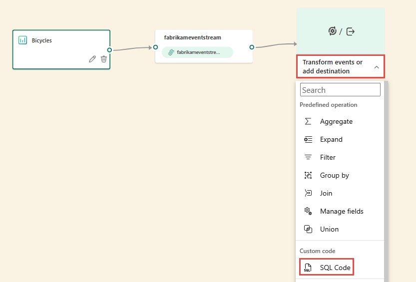 Erstellen Sie einen neuen Eventstream. Fügen Sie dann einen SQL-Operator hinzu, indem Sie eine der folgenden Optionen verwenden: