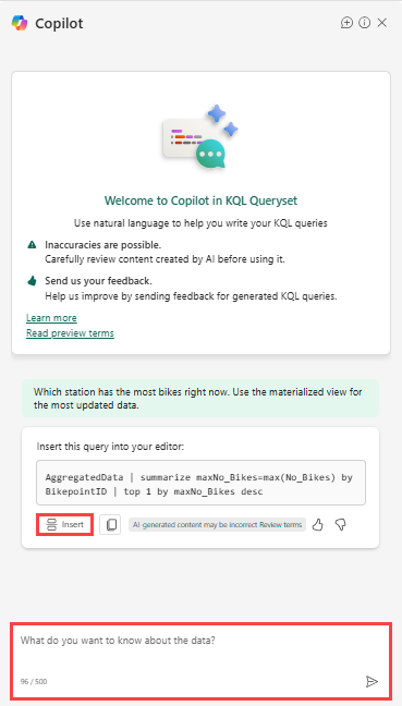 Wenn Sie noch nicht mit dem Schreiben von KQL vertraut sind, können Sie eine Frage in natürlicher Sprache stellen und Copilot generiert die KQL-Abfrage für Sie.