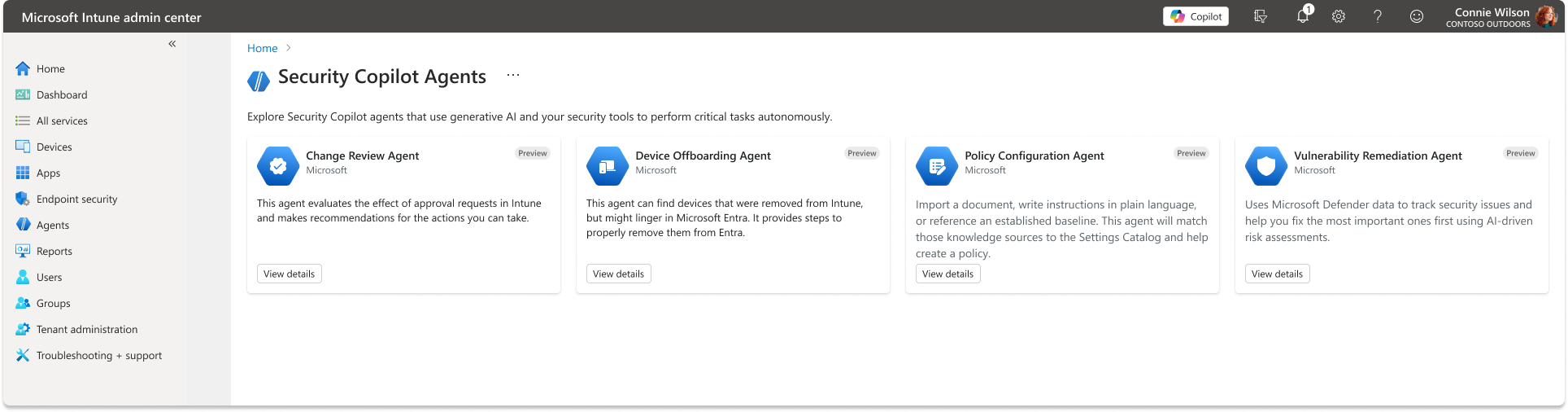 Agents basieren auf den generativen KI- und Automatisierungsfunktionen von Microsoft Security Copilot. Sie beobachten, begründen und handeln mit Aufsicht und Überprüfung von Ihren Administratoren. Jeder Agent ist auf einen bestimmten Anwendungsfall zugeschnitten, arbeitet im Intune Admin Center und verwendet rollenbasierte Zugriffssteuerungen.