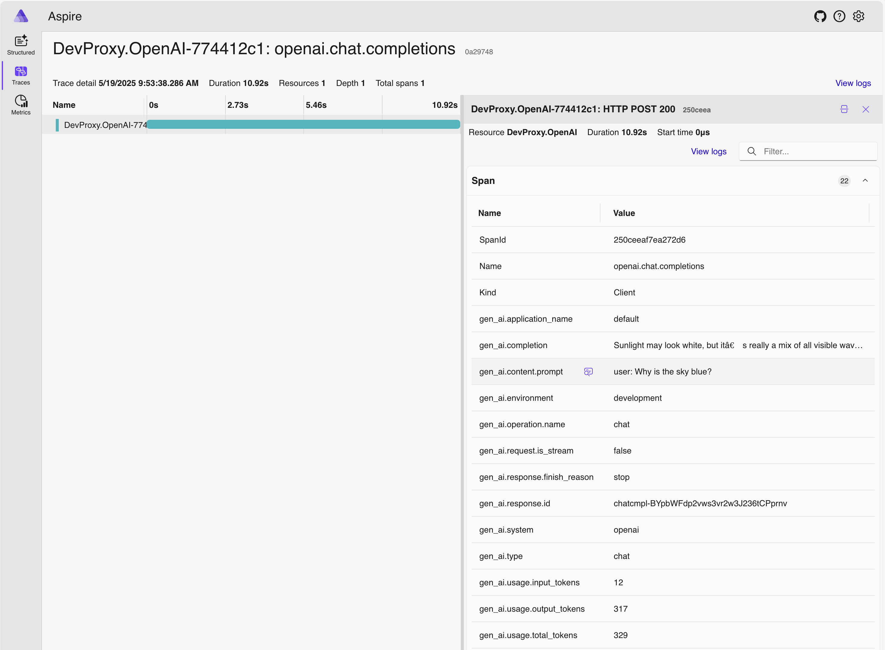 Dev Proxy protokolliert Verwendungsdaten des Sprachmodells im OpenTelemetry-Format. Sie können jedes mit OpenTelemetry kompatible Dashboard verwenden, um die Daten zu visualisieren. Sie können z. B. das .NET Aspire-Dashboard oder OpenLIT verwenden. Die Telemetriedaten enthalten die Anzahl der token, die in der Anforderung und Antwort verwendet werden, die Kosten der verwendeten Token und die Gesamtkosten aller Anforderungen im Verlauf einer Sitzung.