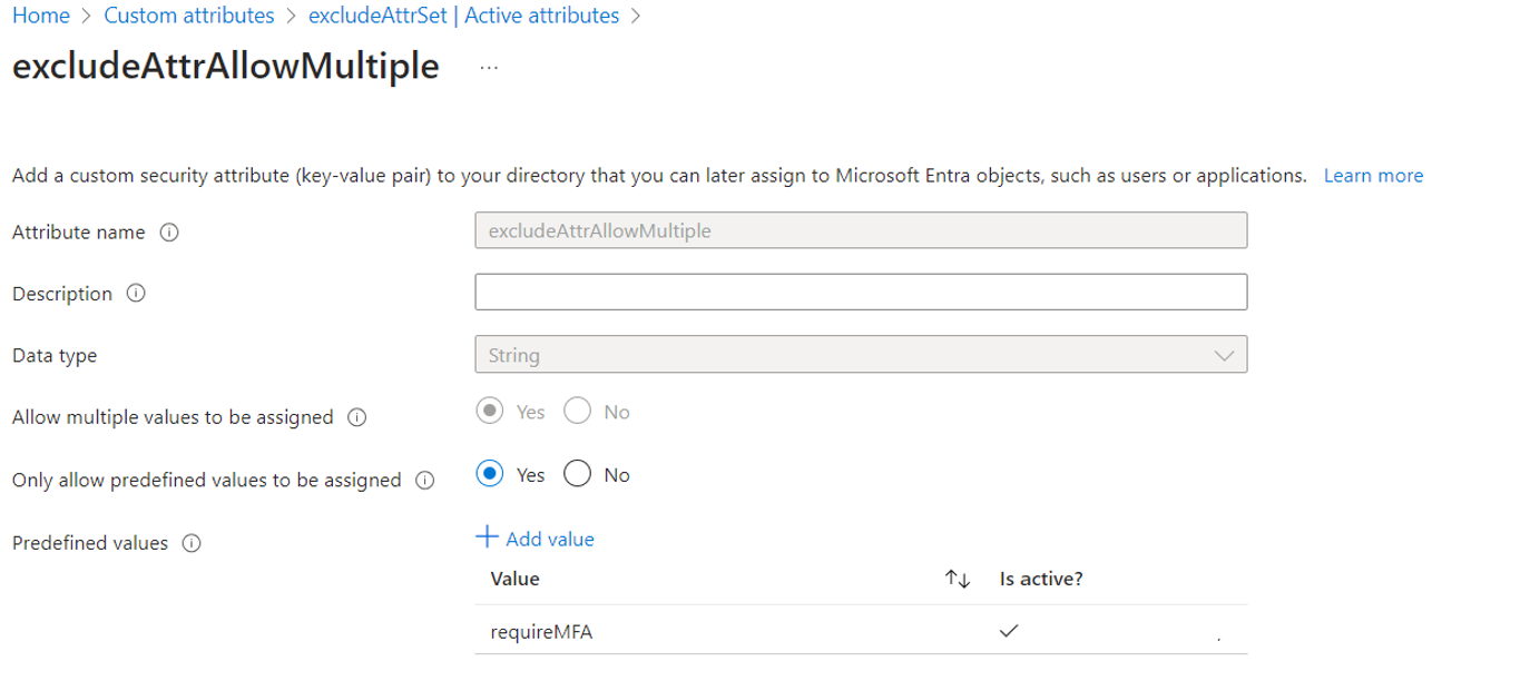 - Wählen Sie Ja aus, wenn benutzerdefinierte Sicherheitsattribute Aus einer vordefinierten Werteliste Werte zugewiesen werden können.