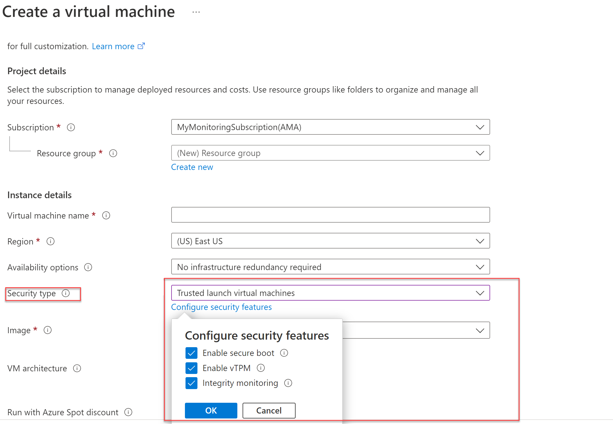 - Stellen Sie beim Erstellen der virtuellen Maschine sicher, dass Sie die Sicherheit für die Startkomponenten konfigurieren. Durch die erweiterte Bereitstellung virtueller Maschinen können Sie den Sicherheitstyp auswählen und Sicherer Start und vTPM.