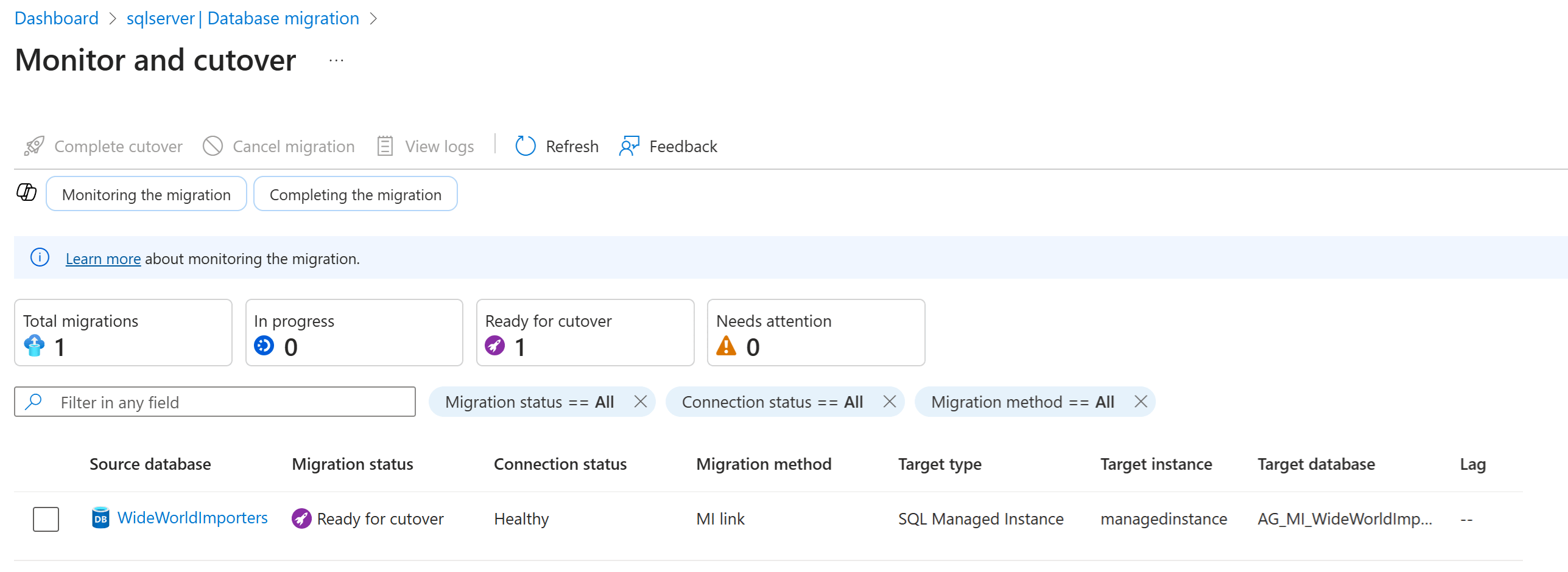 Sie können die Migration im Monitor- und Umstellungsbereich abschließen oder abbrechen. Sie können protokolle auch anzeigen, um Informationen zur Migration zu erhalten. Wenn Sie eine Datenbank auswählen, gelangen Sie zu einem Bereich mit weiteren Details zur Quelle und zum Ziel.