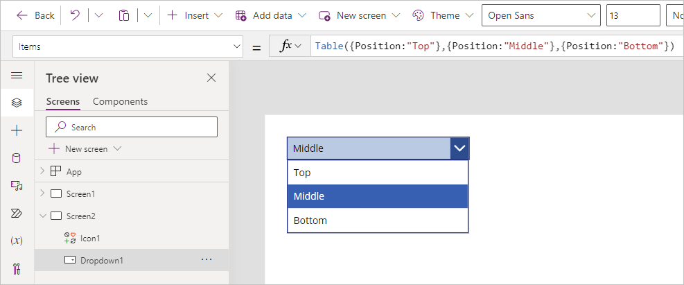 Table({Position:"Top"},{Position:"Middle"},{Position:"Bottom"})Dadurch wird eine Tabelle mit Datensätzen in einer einzelnen Spalte mit dem Namen Position mit drei Datensätzen mit den Namen Top, Bottom und Middle erstellt. Wenn Sie Ihr Dropdown-Steuerelement auswählen, während Sie die ALT-Taste gedrückt halten, werden diese Werte angezeigt.