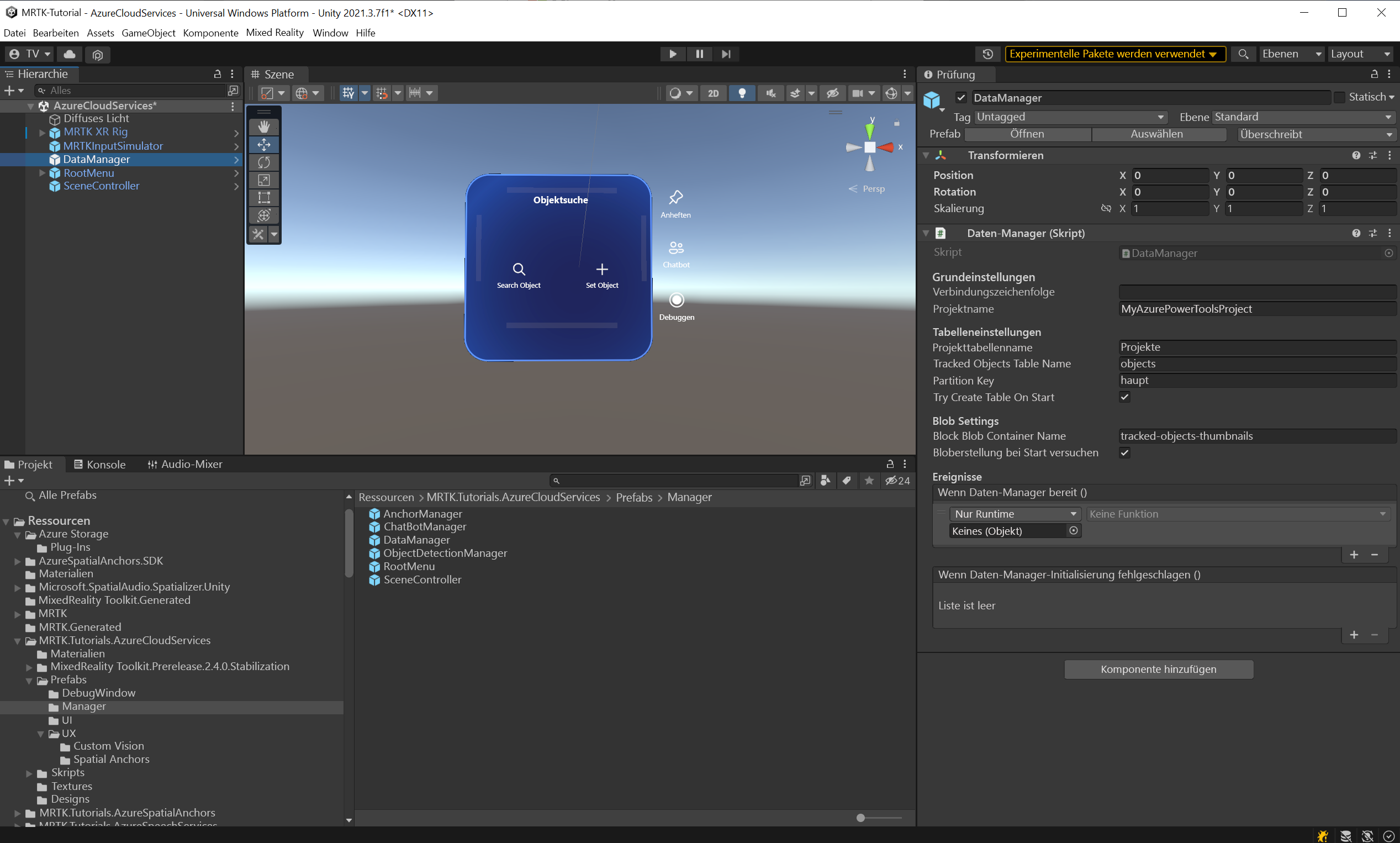 Der DataManager (Prefab) ist für die Kommunikation mit Azure Storage verantwortlich und wird im nächsten Lernprogramm weiter erläutert.