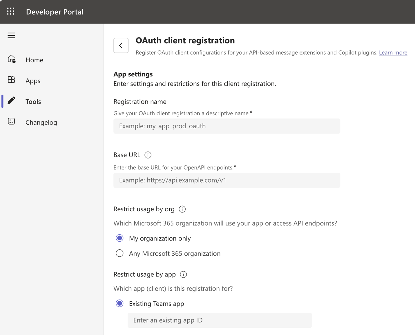 Während der Entwicklung können Sie Ihre OAuth-Entwicklungsinformationen selbst im Tresor registrieren, indem Sie entweder manuell zum Teams-Entwicklerportal wechseln und im Abschnitt Tools die OAuth-Clientregistrierung öffnen oder das Microsoft 365 Agents Toolkit verwenden. In der Produktion registriert in der Regel ein Administrator die OAuth-Informationen und gibt Ihnen die ID des Tresoreintrags zur Verwendung in Ihrem API-Plug-In.