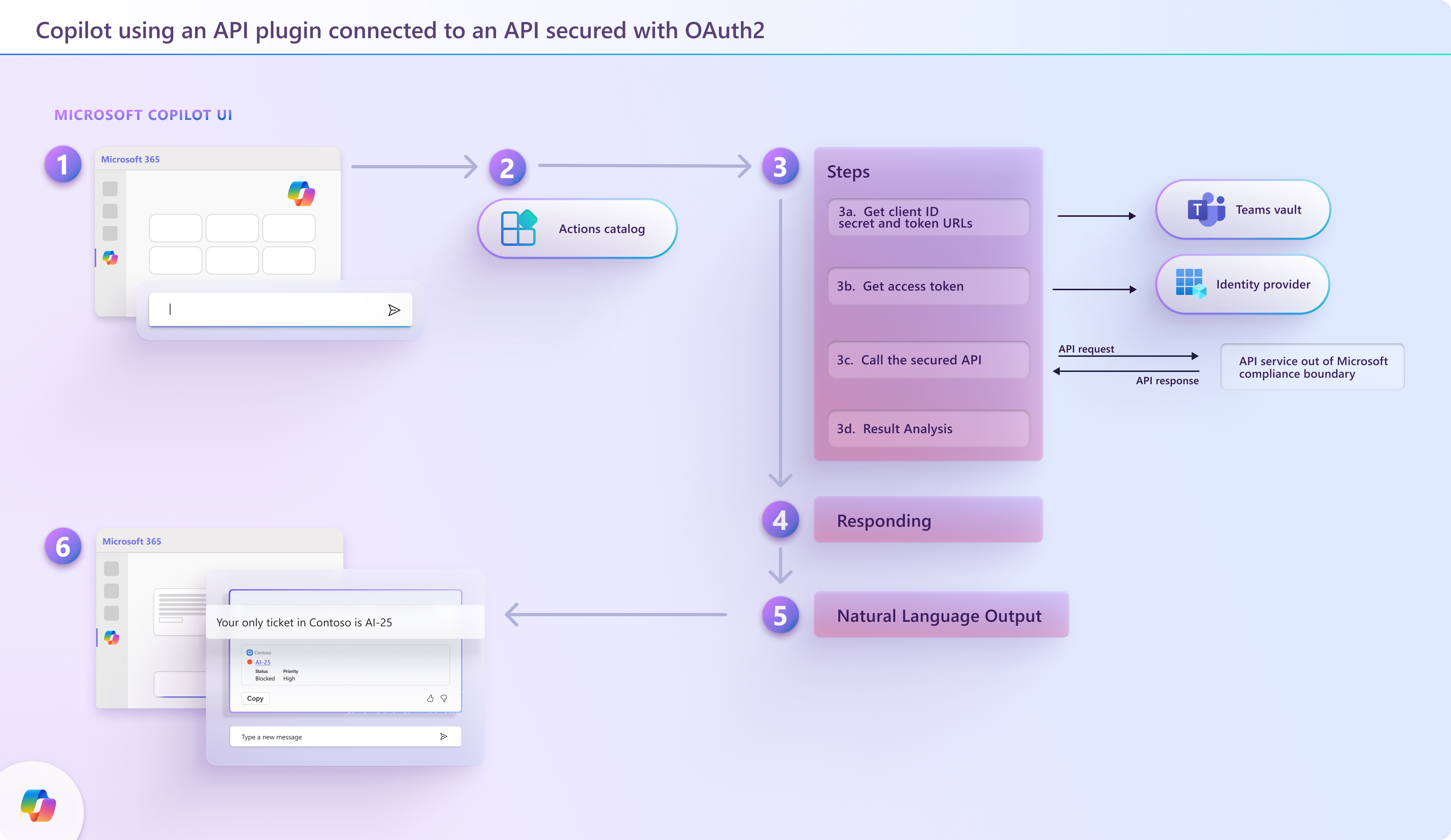 Wenn Sie API-Plug-Ins in eine api integrieren, die mit OAuth gesichert ist, benötigen Sie die Client-ID und den geheimen Clientschlüssel der Anwendung, die die API sichert. Außerdem benötigen Sie die Autorisierungs-, Token- und optional Aktualisierungsendpunkte des Identitätsanbieters. Microsoft 365 Copilot verwendet diese Informationen, um sich im Namen des aktuellen Benutzers bei der API zu authentifizieren und ein Zugriffstoken abzurufen. Da die Informationen vertraulich sind, speichern Sie sie sicher am sicheren Speicherort in Microsoft 365, der auch als Tresor bezeichnet wird. Anschließend verweisen Sie in Ihrer App auf die ID des Tresoreintrags. Zur Laufzeit lädt der deklarative Agent Ihr Plug-In (2) und ruft die Informationen aus dem angegebenen Eintrag (3a) ab. Der deklarative Agent folgt dem Autorisierungscode-Gewährungstyp, der auch als Authentifizierungscodeflow bezeichnet wird, um ein Zugriffstoken (3b) abzurufen, das er zum Aufrufen der API (3c) verwendet. Das folgende Schema veranschaulicht diesen Vorgang.