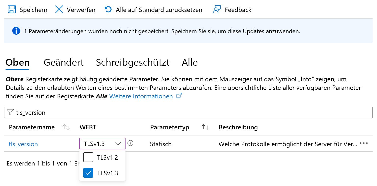 Standardmäßig akzeptieren flexible MySQL-Server nur verschlüsselte Verbindungen mit TLS (Transport Layer Security) Version 1.2. Wenn Sie neue Anwendungen entwickeln, die TLS 1.3 unterstützen, wird empfohlen, die neuere Version zu unterstützen oder sogar zu erzwingen. Führen Sie dazu die folgenden Schritte aus: