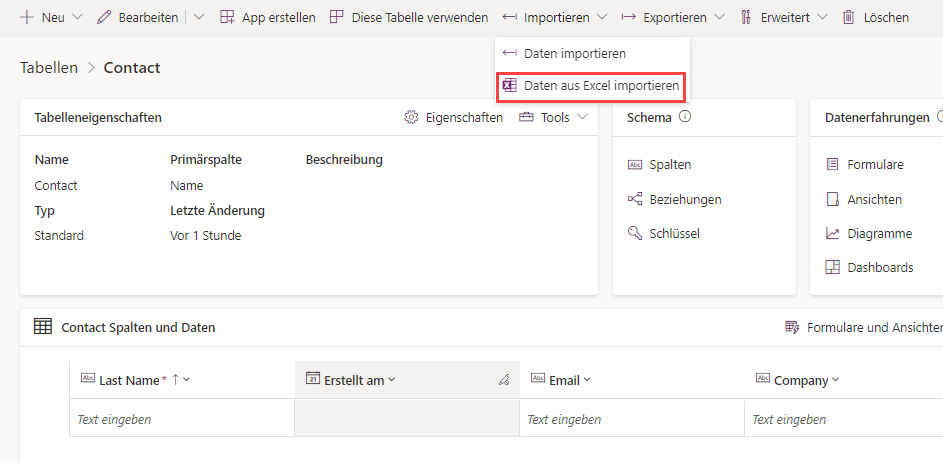 Der Import aus Excel in modellgesteuerten Apps importiert eine einzelne Datei über die Befehlsleiste in einer modellgesteuerten App in eine einzelne Tabelle und bietet die gleichen Vor‑ und Nachteile wie der Datenimport-Assistent.